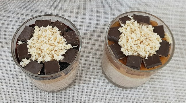 – 2 bucăți de ciocolată amăruie, vegană cu cocos. Fiecare bucățică a fost ruptă în 4 bucățele cu care am ornat vasul desertului de jur-împrejur.