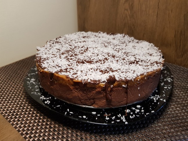 Acest tort este pe bază de nuci, cocos, curmale și ciocolată. Nu conține gluten, este vegan (evident) și, partea mea preferată, fără coacere.