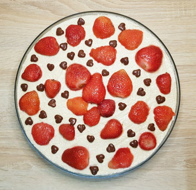 4. Decorează tortul după bunul plac. Eu am ales căpșuni și inimioare de ciocolată.