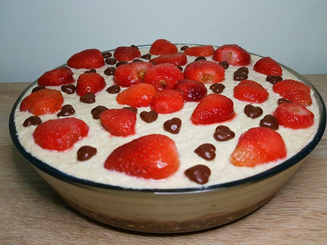 Rețeta nu conține gluten, poți să alegi să ornezi doar cu fructe sau să înlocuiești inimioarele decorative de ciocolată cu nucă de cocos rasă sau drajeuri raw de la Ombar 😊