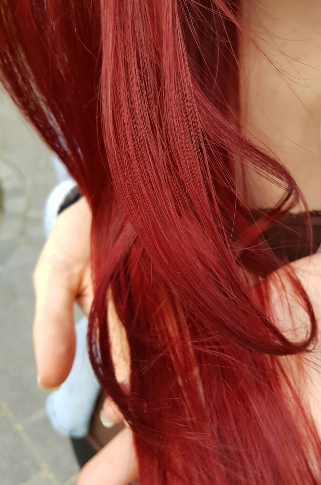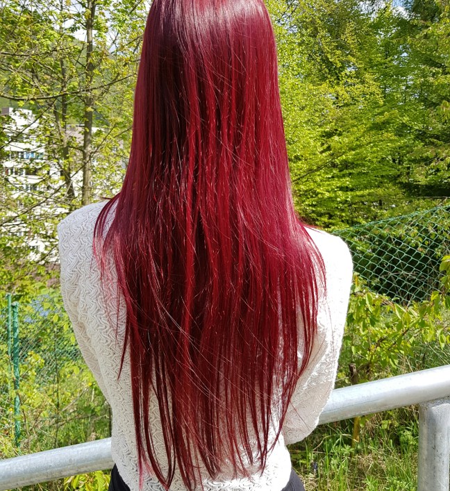 1. Culoarea părului meu în funcție de lumină: roșu-sângeriu, roșu-zmeuriu și roșu-vișiniu.