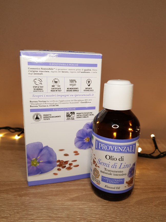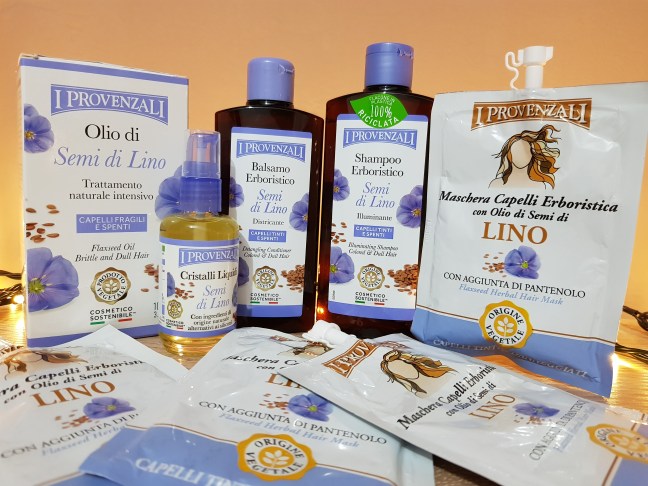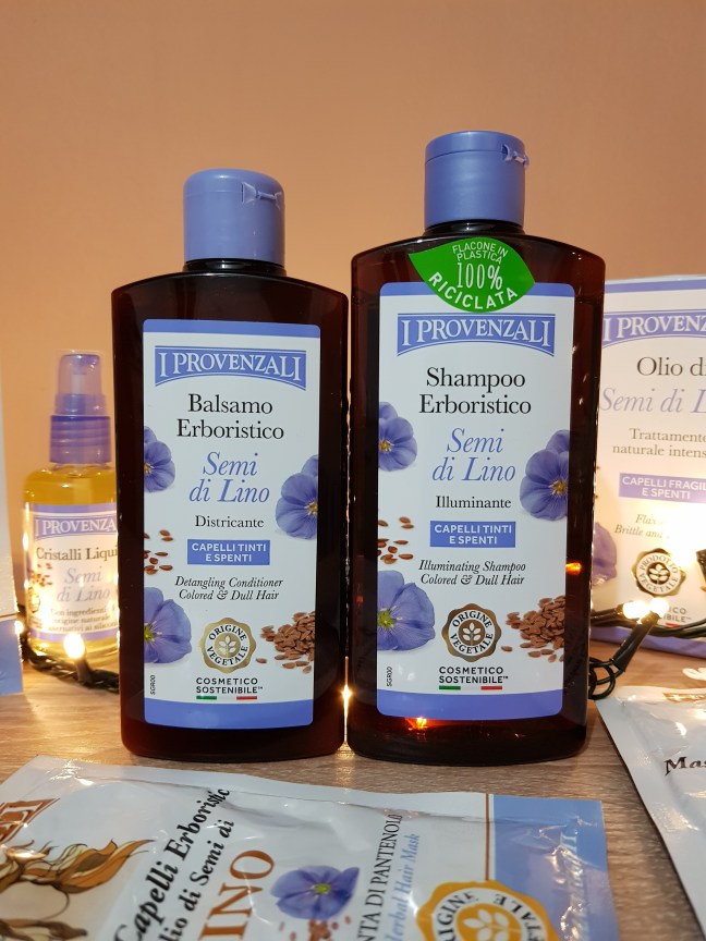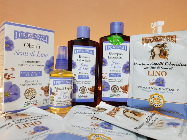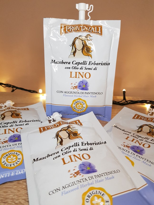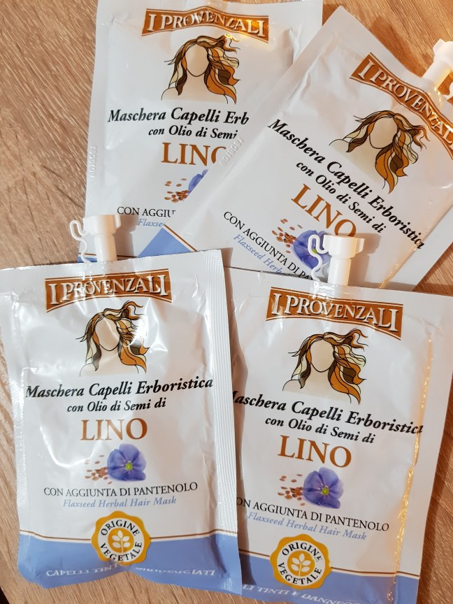 Când am testat o parte dintre produsele din gama Rosa Mosqueta de la I Provenzali, am primit cadou două pliculețe de mască pentru păr, de 50ml, din gama cu semințe de in.