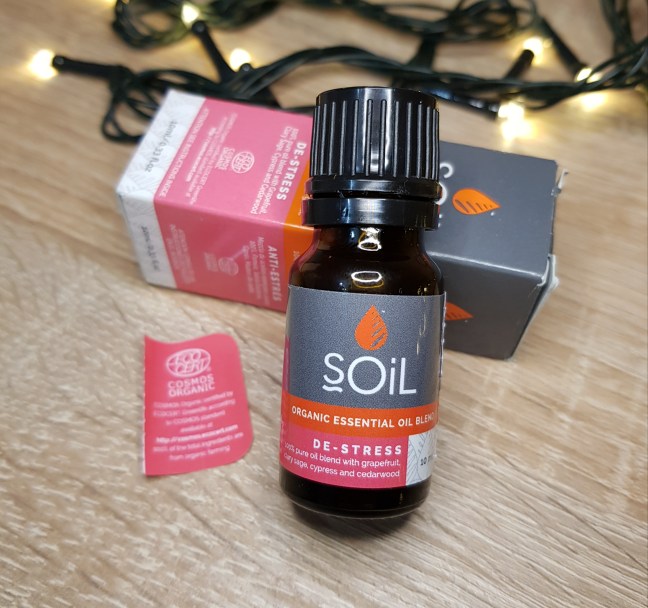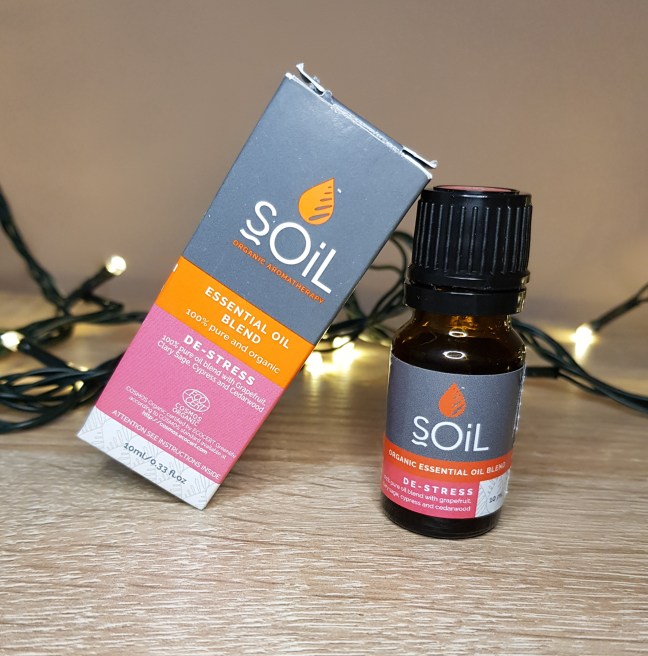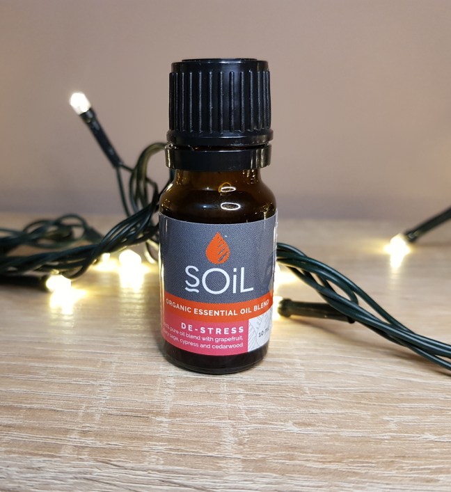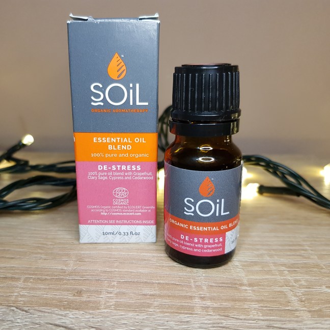 Blend-ul “de-stress” conține uleiuri esențiale de grapefruit, salvie, chiparos și lemn de cedru.