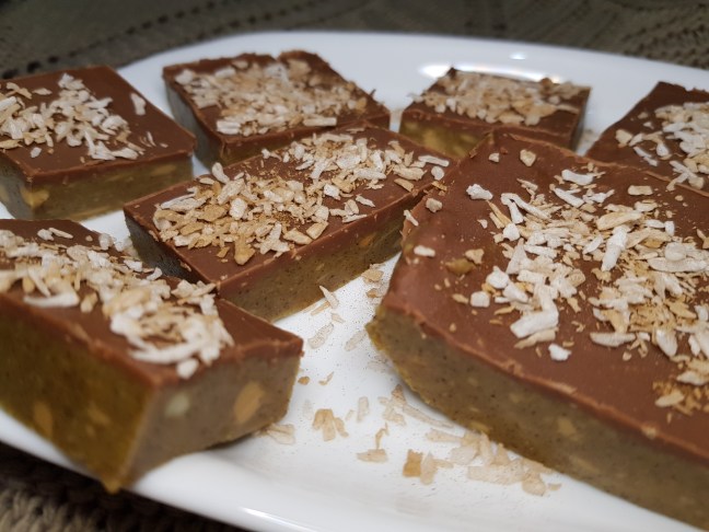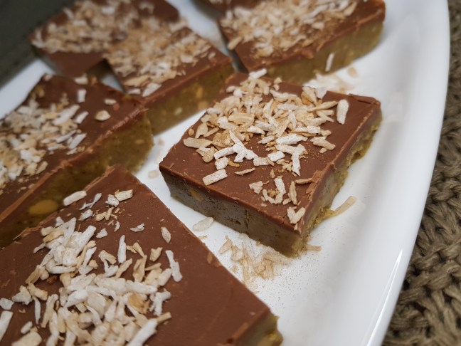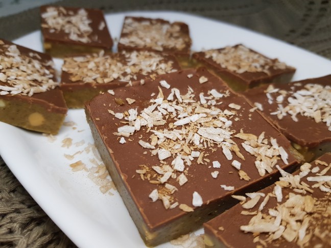 7. Pentru decor am amestecat nuca de cocos rasă cu scorțișoara măcinată și am presărat totul peste batoane;