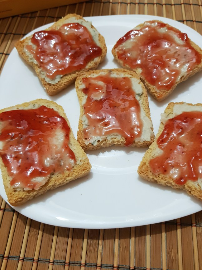 Pentru că ador brânzicile de caju de la NoMoMoo și cea cu mucegai mi se pare foarte apropiată la gust de brânza topită pe care o consumam cândva, am combinat cele două “amintiri” și am descoperit un mic dejun sățios și gustos.