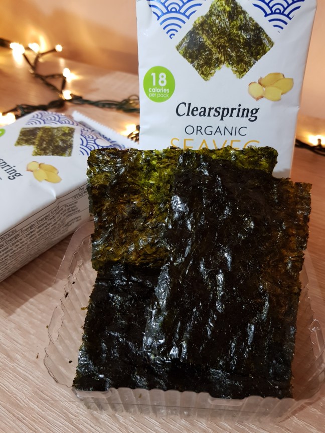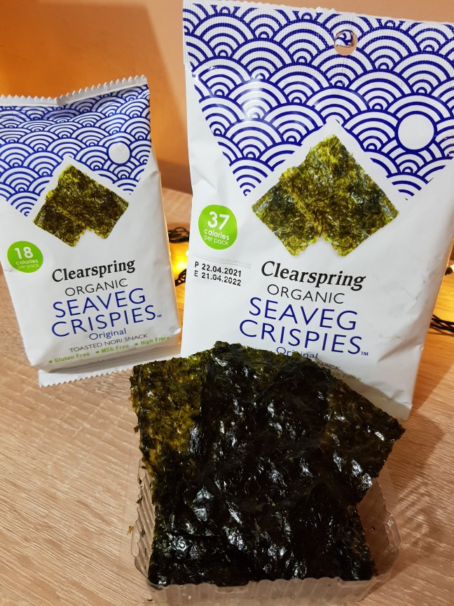 Snackurile de la Clearspring sunt vegane și sunt realizate din alge nori uscate, subțiri și crocante, coapte pentru câteva secunde la temperaturi foarte ridicate.