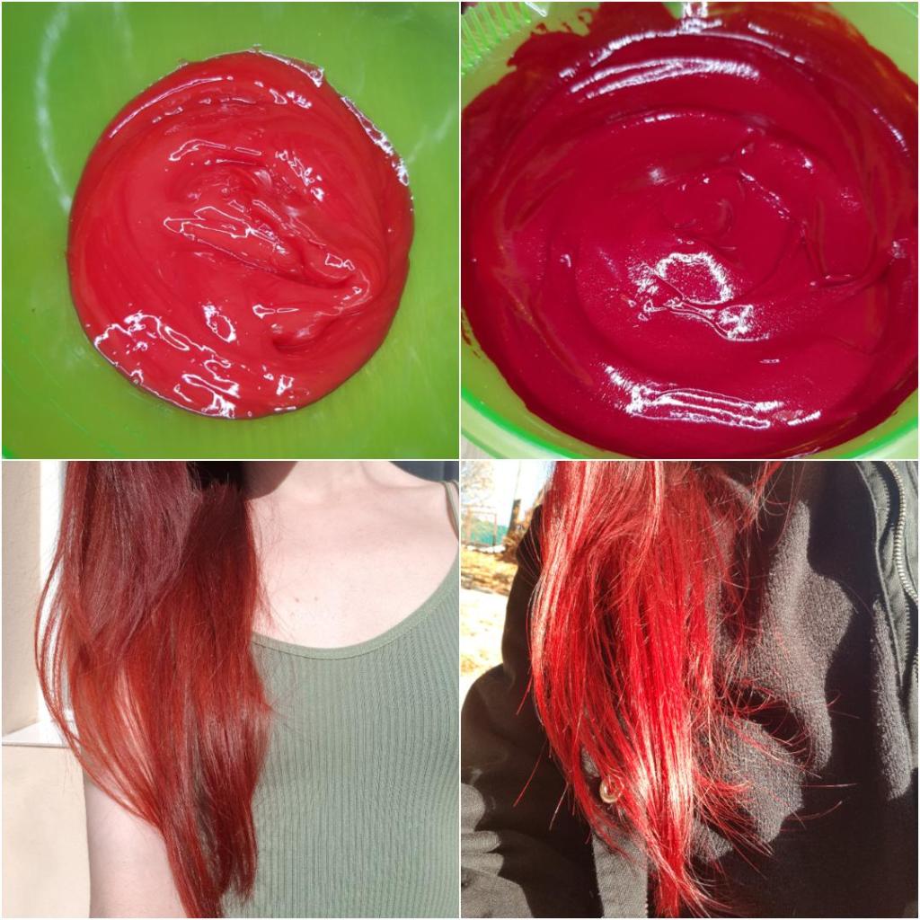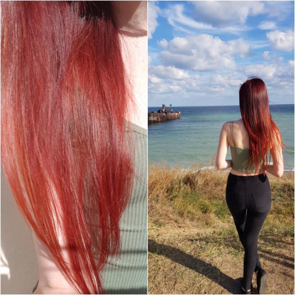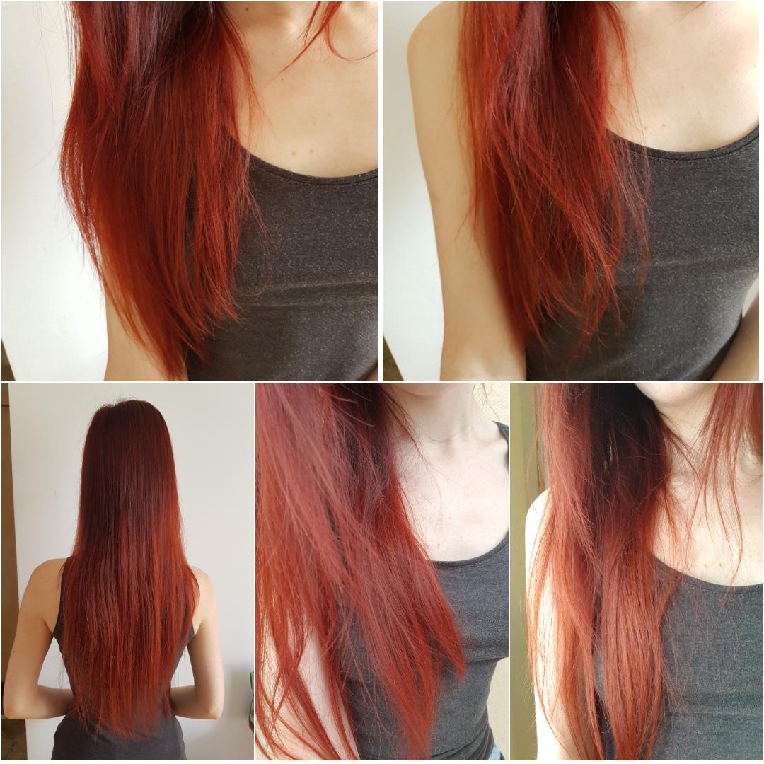 Culoarea rezultată a fost aplicată pe o culoare destul de apropiată de cea a părului meu natural combinat cu tente roșiatice și portocalii – nu mă mai vopsisem de vreo trei sau patru luni.