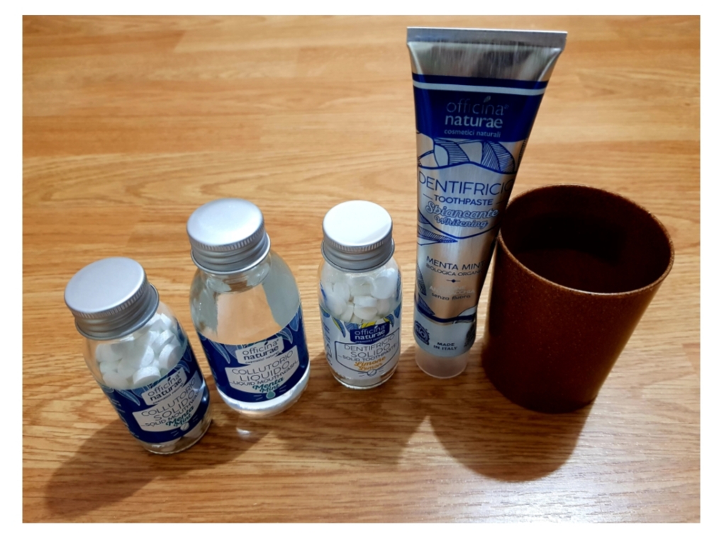 Pasta de dinți de tip tablete și cele două ape de gură, ocupă puțin spațiu, fiind ideale pentru călătorii.