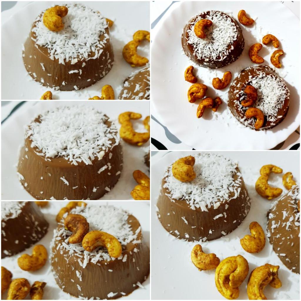 Budinca vegană cu caramel am servit-o cu nucă de cocos rasă și nuci de caju coapte.