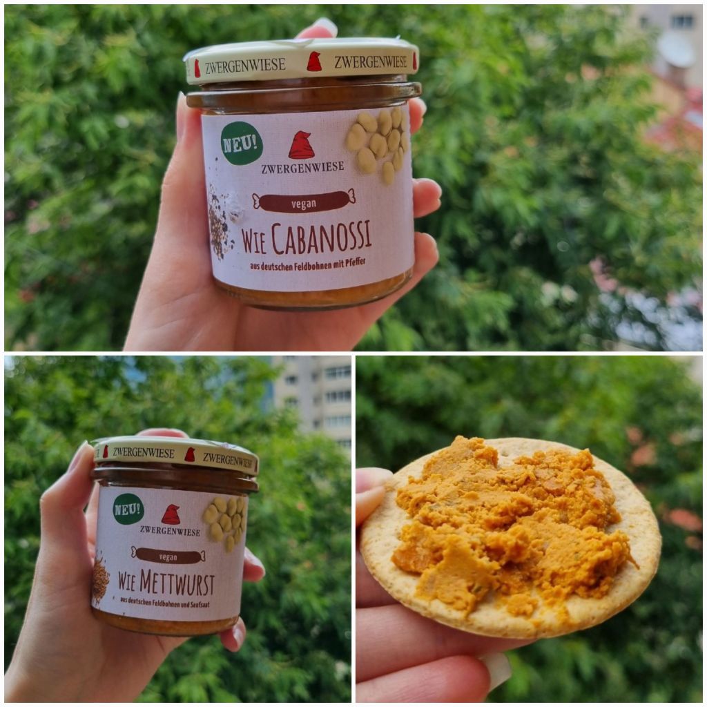 Cele două creme tartinabile vegane de la Zwergenwiese, imită gustul cârnaților reprezentați pe ambalaj: Mettwurst şi Cabanossi.