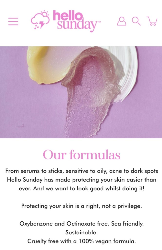 Brandul pune la dispoziție produse multifuncționale cu SPF pentru: ten, mâini, corp, buze și ochi; produse ce se folosesc după expunerea la soare, autobronzante, dar și diverse tratamente cu SPF (spre exemplu, pentru pete pigmentare) – mai multe informații despre brand: Hello Sunday.